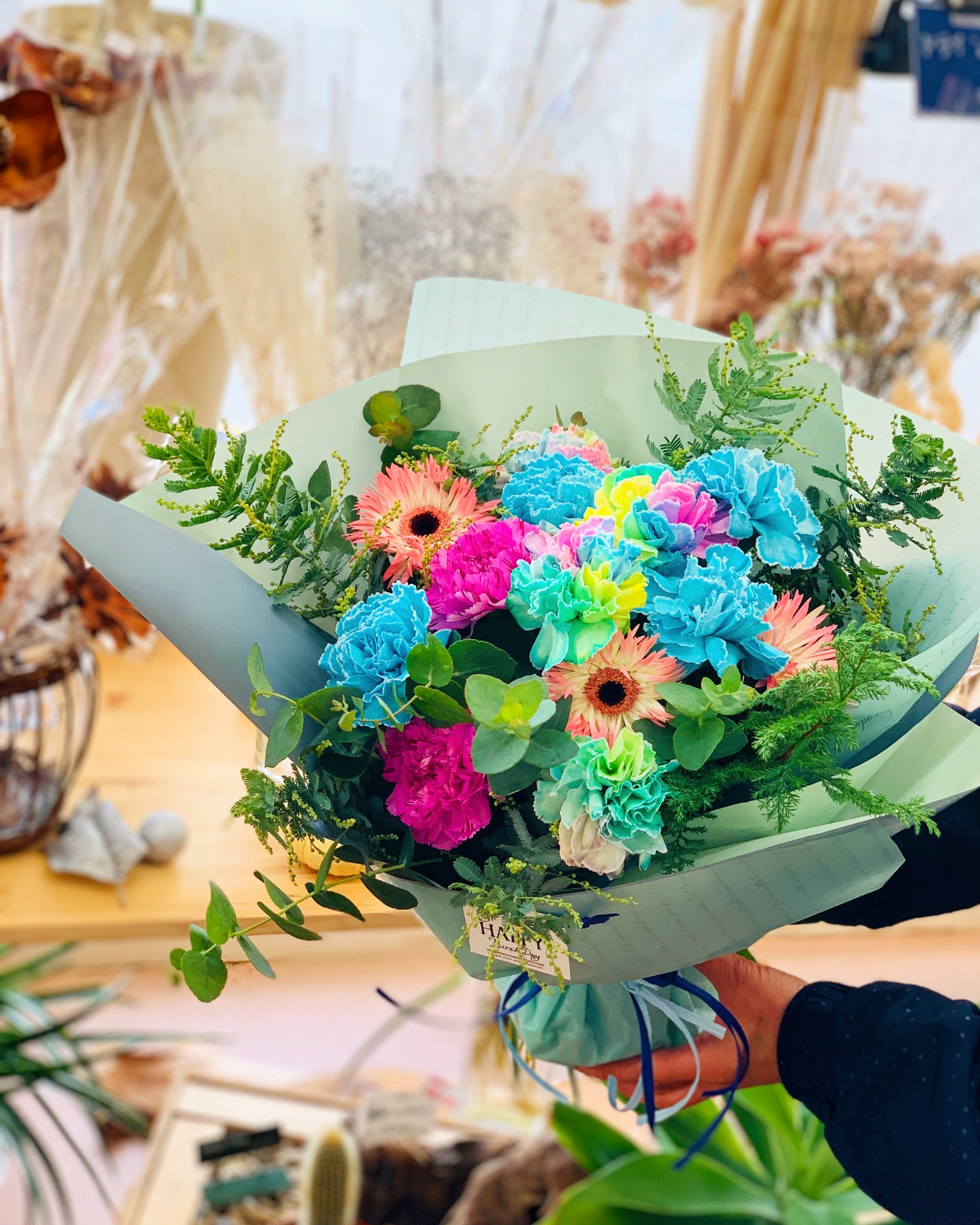 お祝いに花束を贈られたり、大きなステージ花やお部屋のテーブル花、玄関のお花など様々なご注文を承っております!